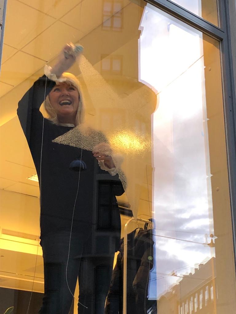 Kun sapluuna on valmis, teippaa se ikkunaan kaksipuoleisella teipillä tai sinitarralla. Leikkaa sitten pesusienestä pienehköjä paloja tuputusta varten sekä kaada rasvatonta piimää kulhoon.