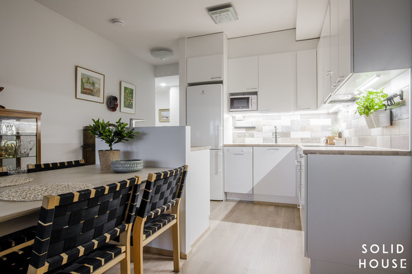 Kurkataan tähän valoisaan kolmioon, jonka sijainti on yksi alueen halutuimmista upeine näköaloineen. Asunnon pintamateriaalit on valittu aikaa kestäviksi. Tammiparketin suosio on on taas kovaa vauhtia kasvanut. Tänne on valittu valkolakattu tammiparketti ja siihen mätsäten on keittiön välitilaan valittu pehmeän lämmin ja elävä laatoitus.