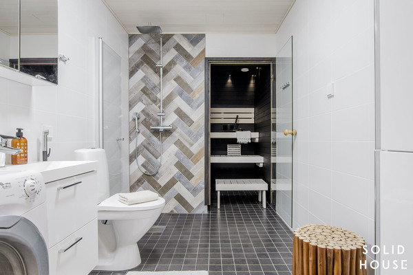 Kylpyhuoneessa on suihkun takana käytetty samaa laattaa kuin keittiössä joka on nyt ladottu kalanruotokuvioon. Hienostunut sauna, jossa vaaleat lauteet tummaa seinää vasten antavat kontrastia sekä tyylikäs laatoitus luovat kylpyhuoneeseen ihanan lämpimän tunnelman.