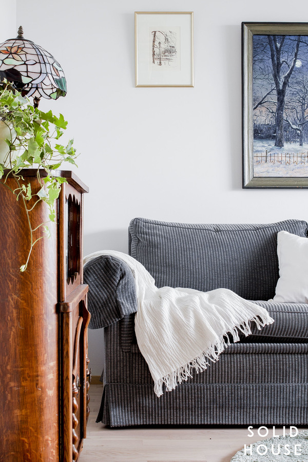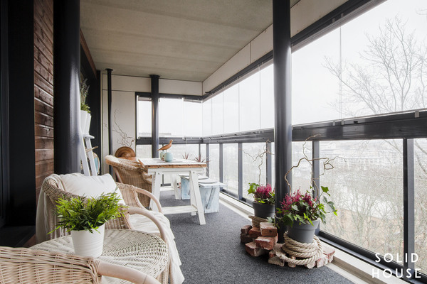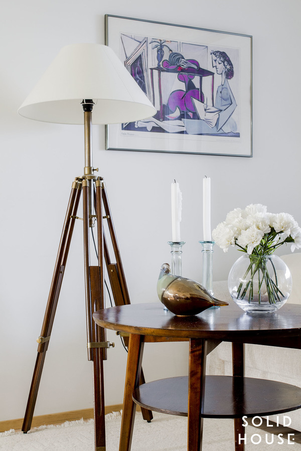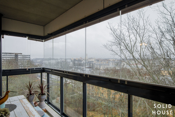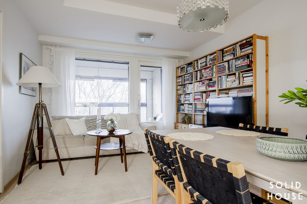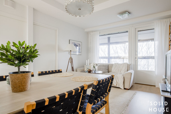 Sisustus on klassisen kaunis Artekin tuoleineen. Tässä asunnossa vietetään varmasi paljon aikaa huoneiston levyisellä lasitetulla parvekkeella näkymiä ihaillen ja uppoutuen unelmiin.