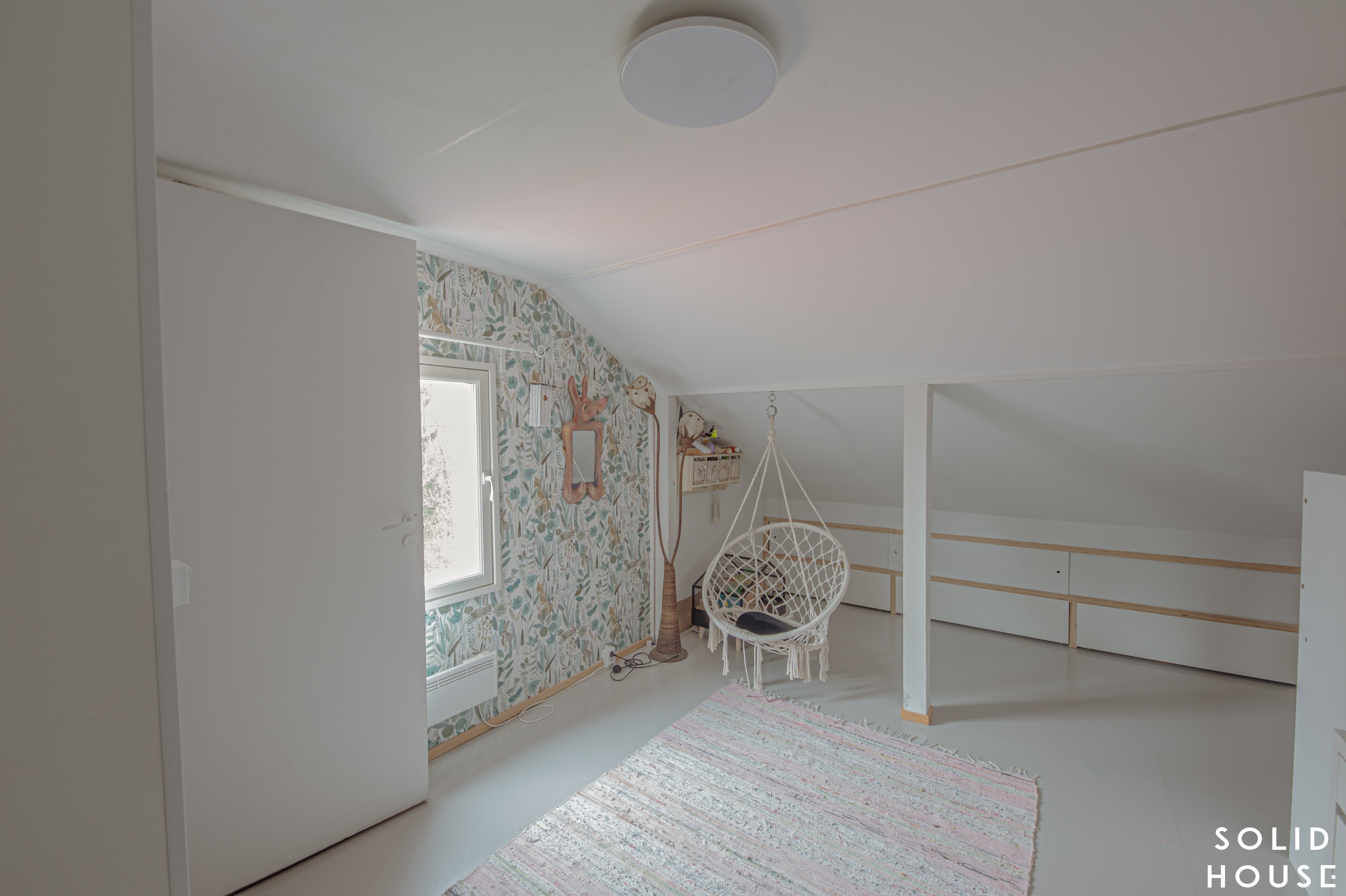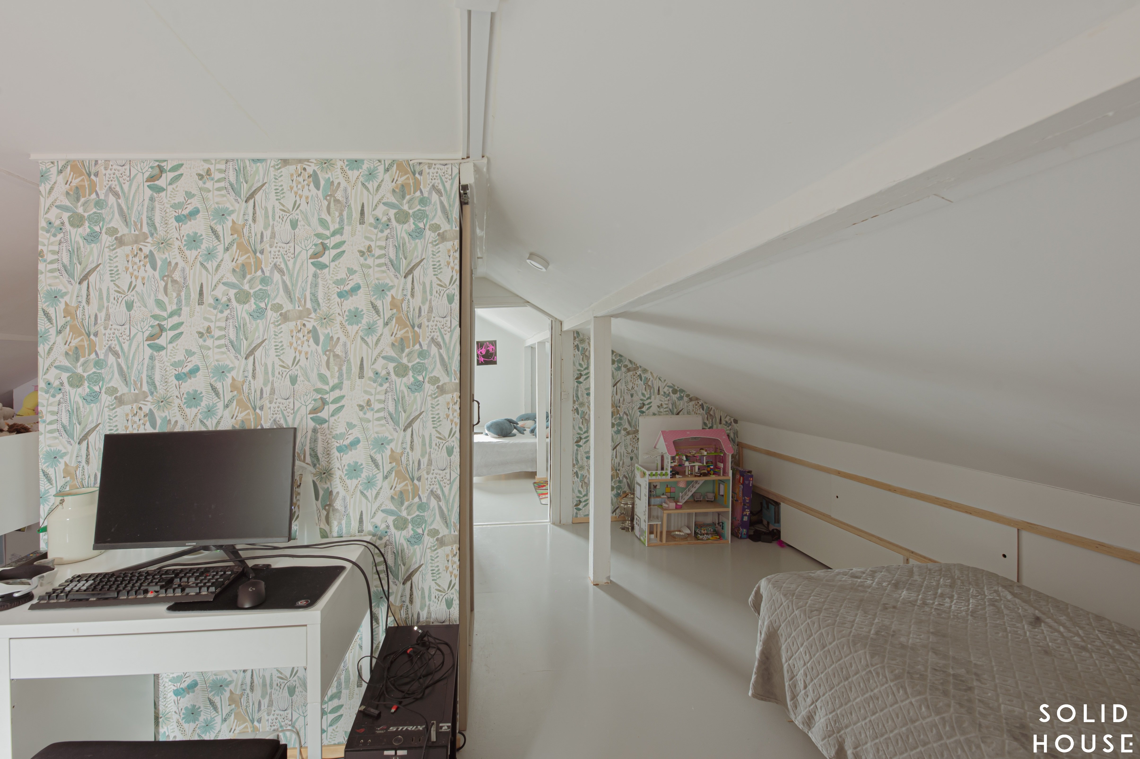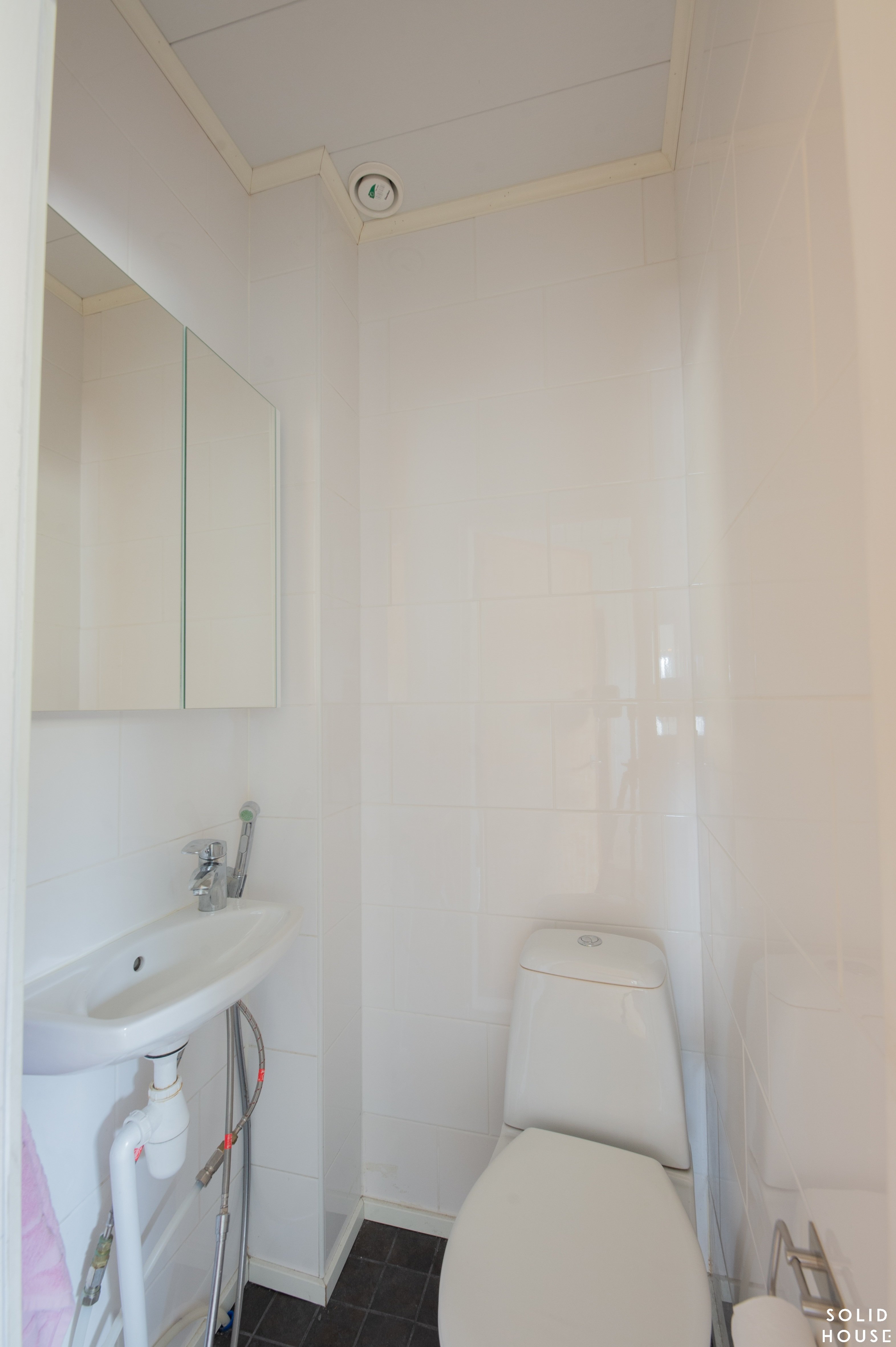Alakerran makuuhuoneen lattia laminaattia. Yläkerran huoneiden lattia maalattu lastulevy. - WC