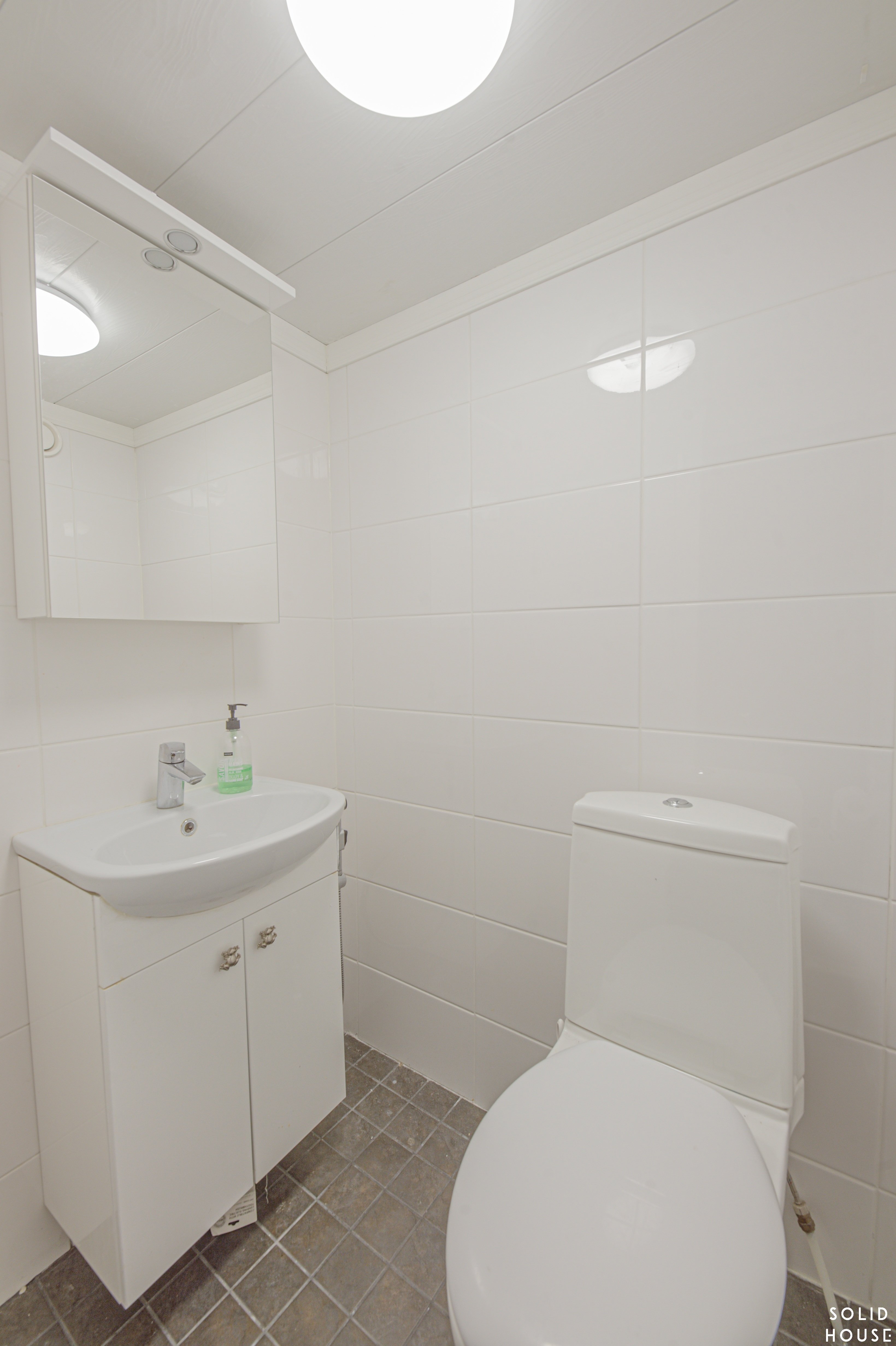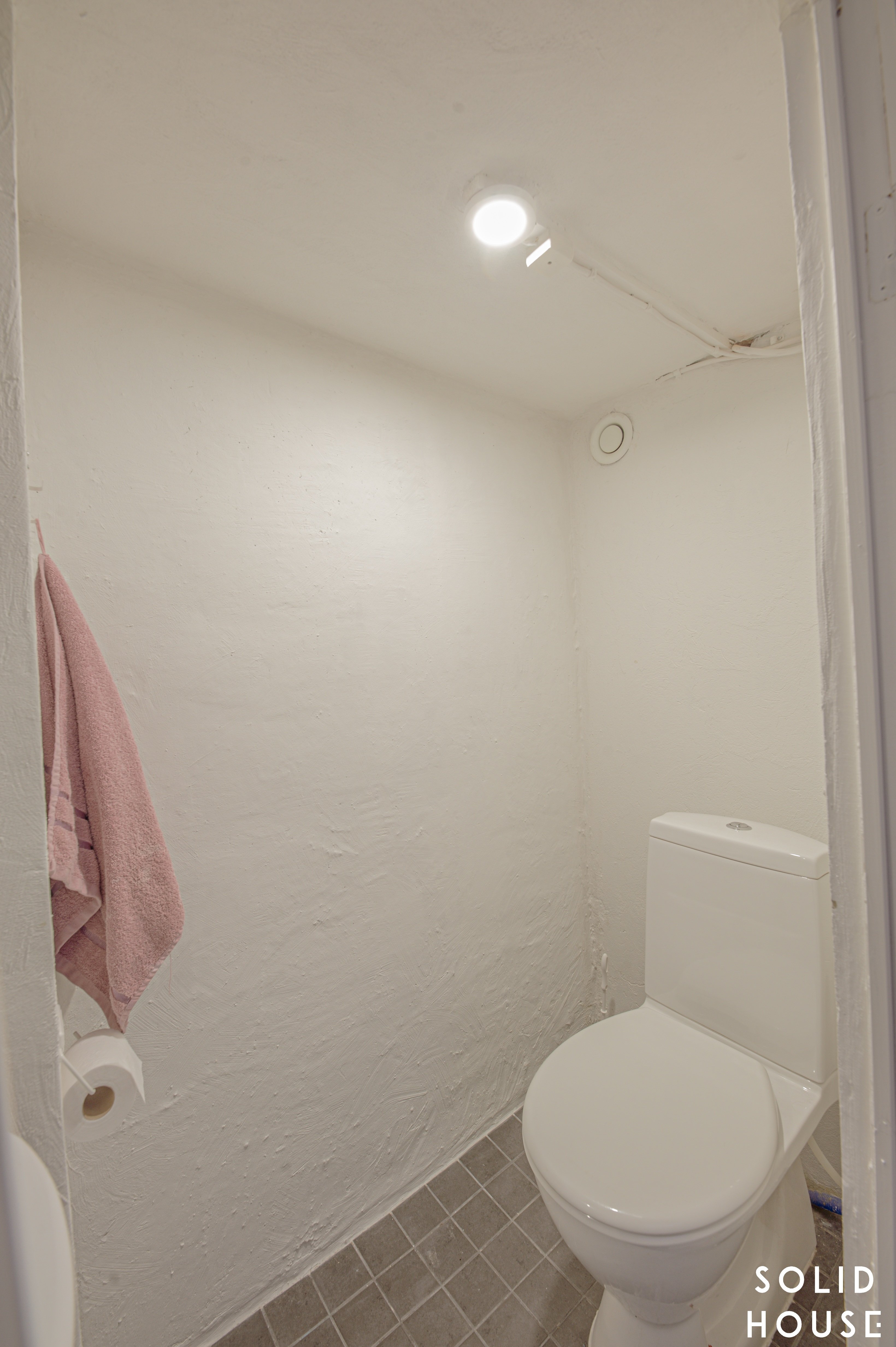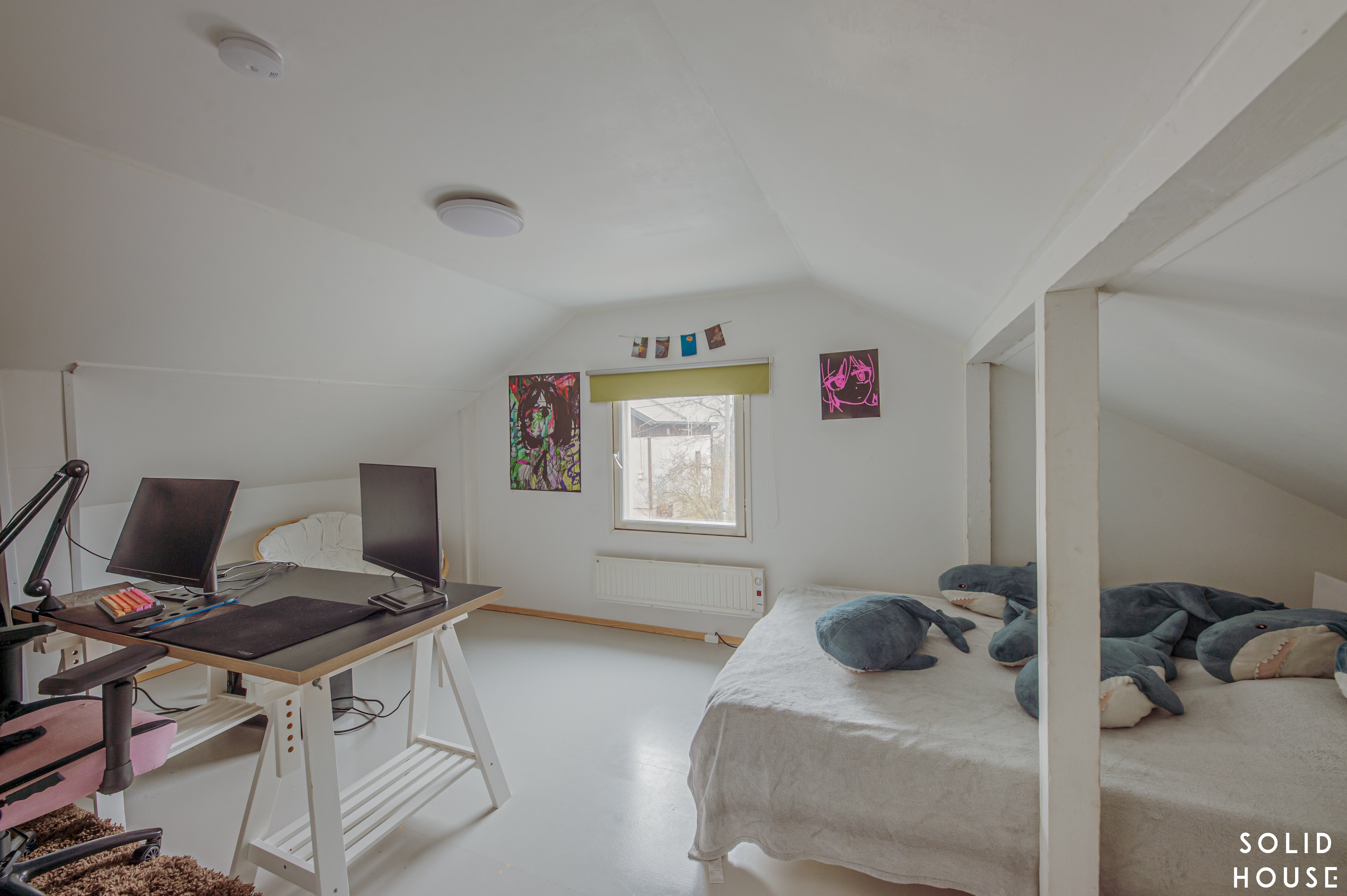 Alakerran makuuhuoneen lattia laminaattia. Yläkerran huoneiden lattia maalattu lastulevy. - WC