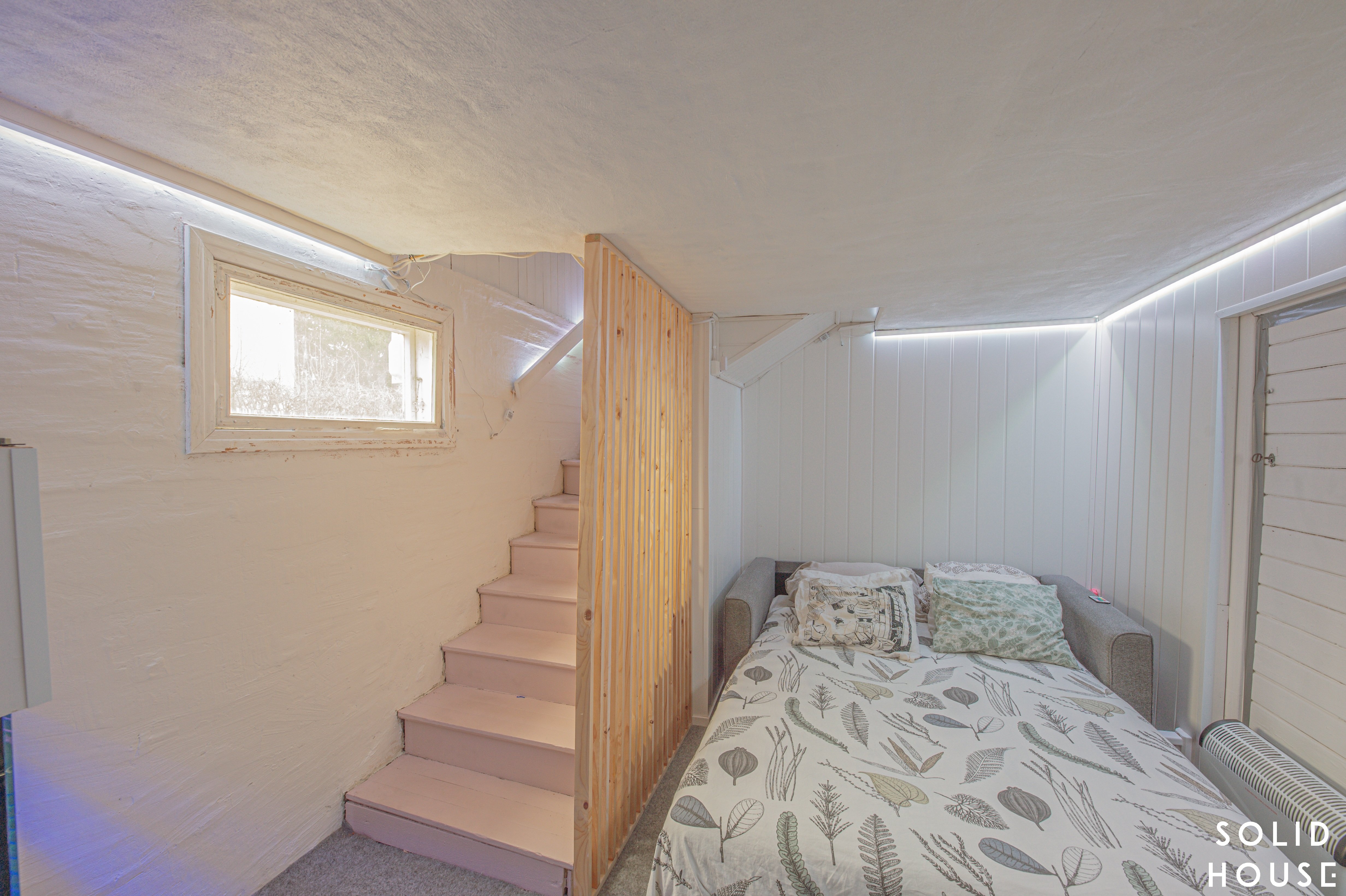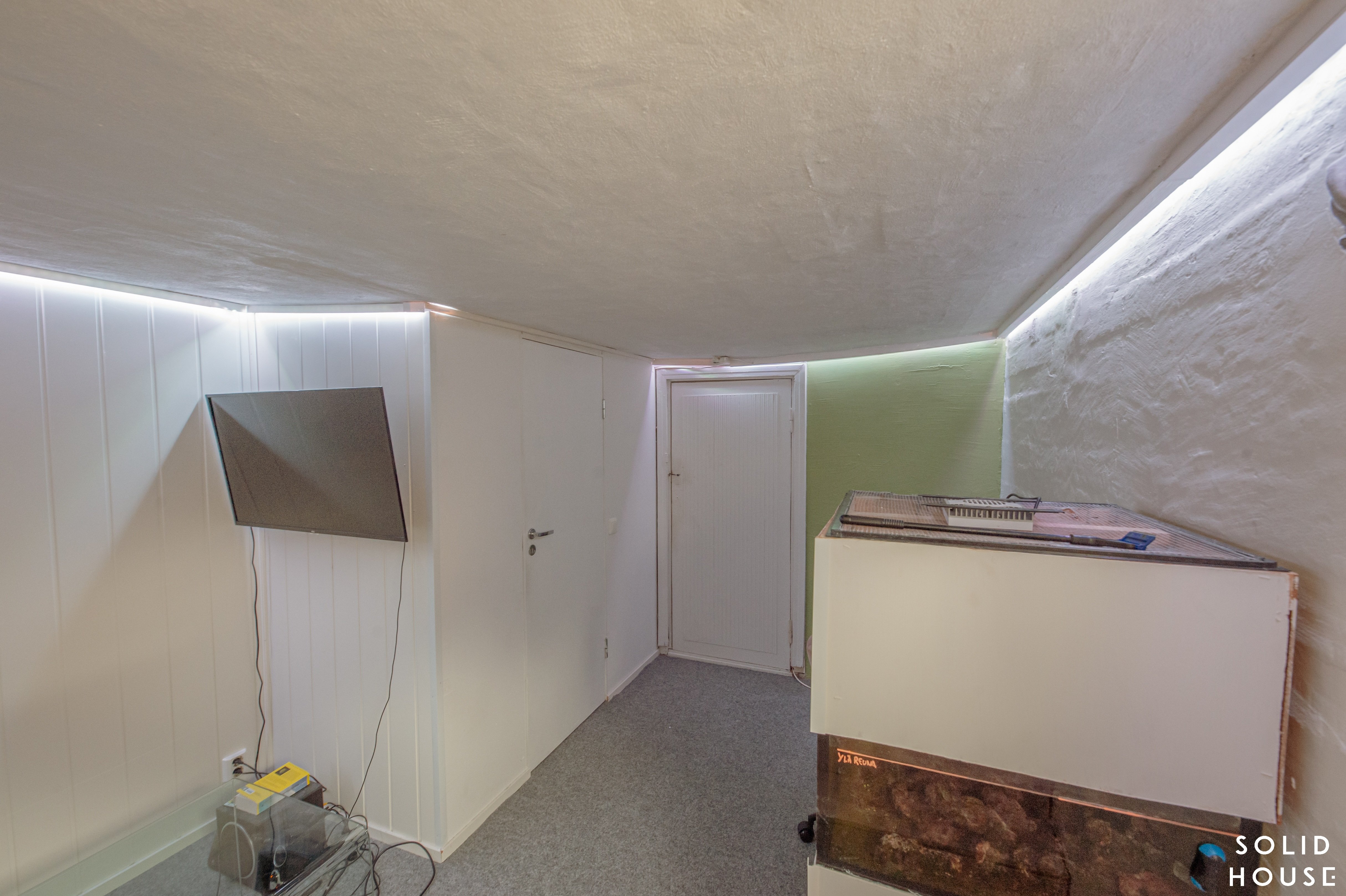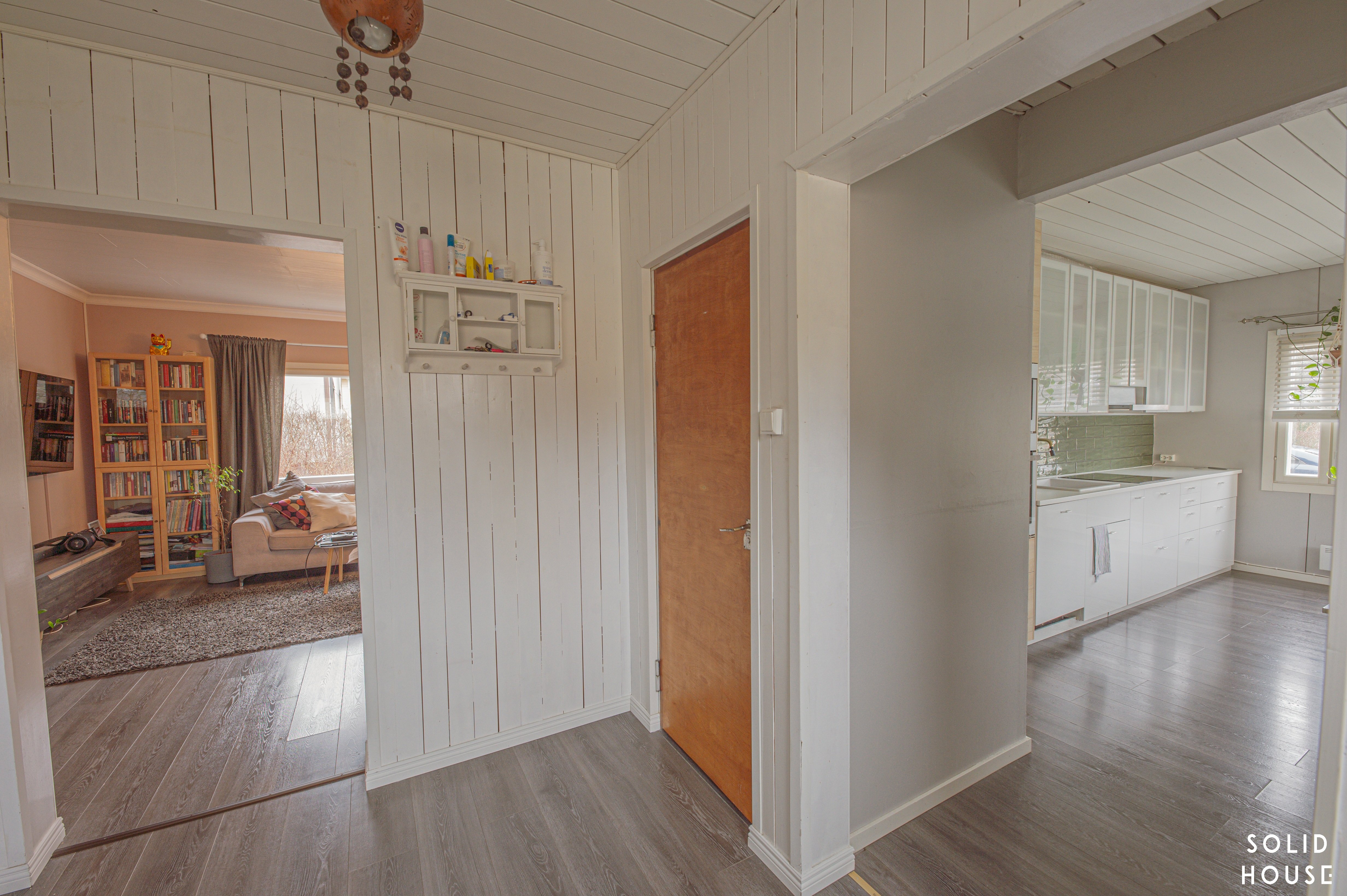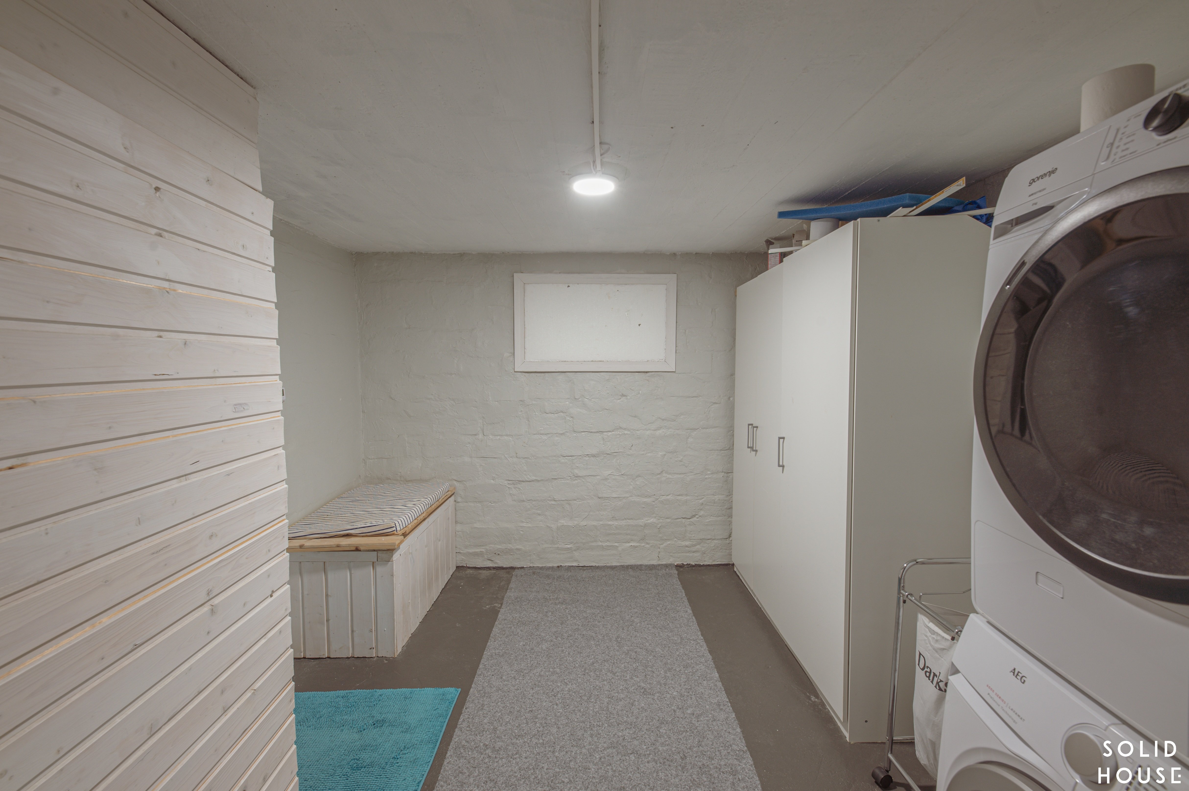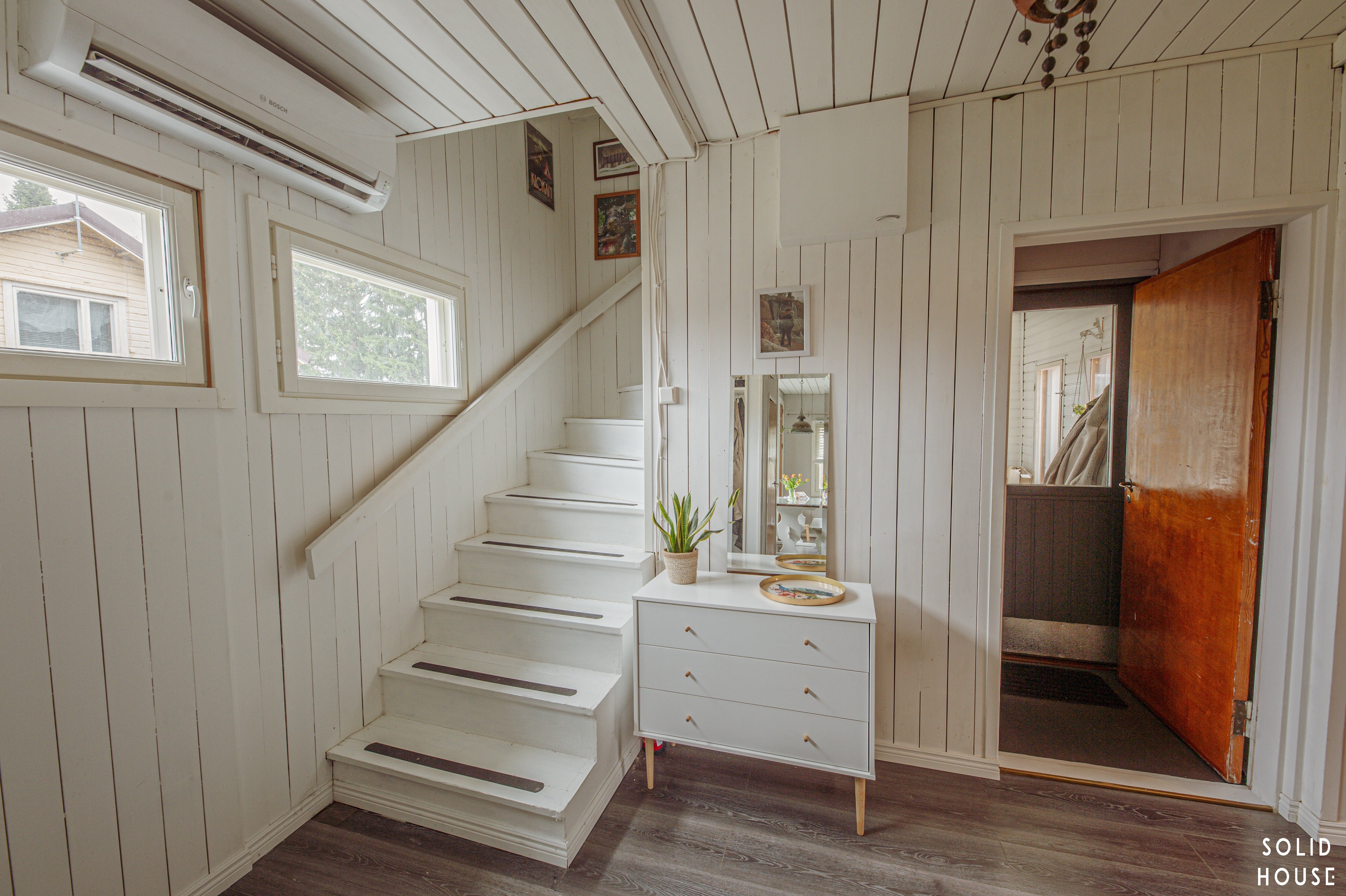 Asuintilat ovat kolmessa kerroksessa. Yläkerrassa on kaksi makuuhuonetta ja wc. Säilytystilaa on hyvin viistokaton alla. Sisääntulokerroksessa on keittiö, olohuone, makuuhuone ja wc. Kellarikerroksessa on kylpyhuone, sauna, kodinhoitotila ja huone, joka toimii tällä hetkellä makuuhuoneena.