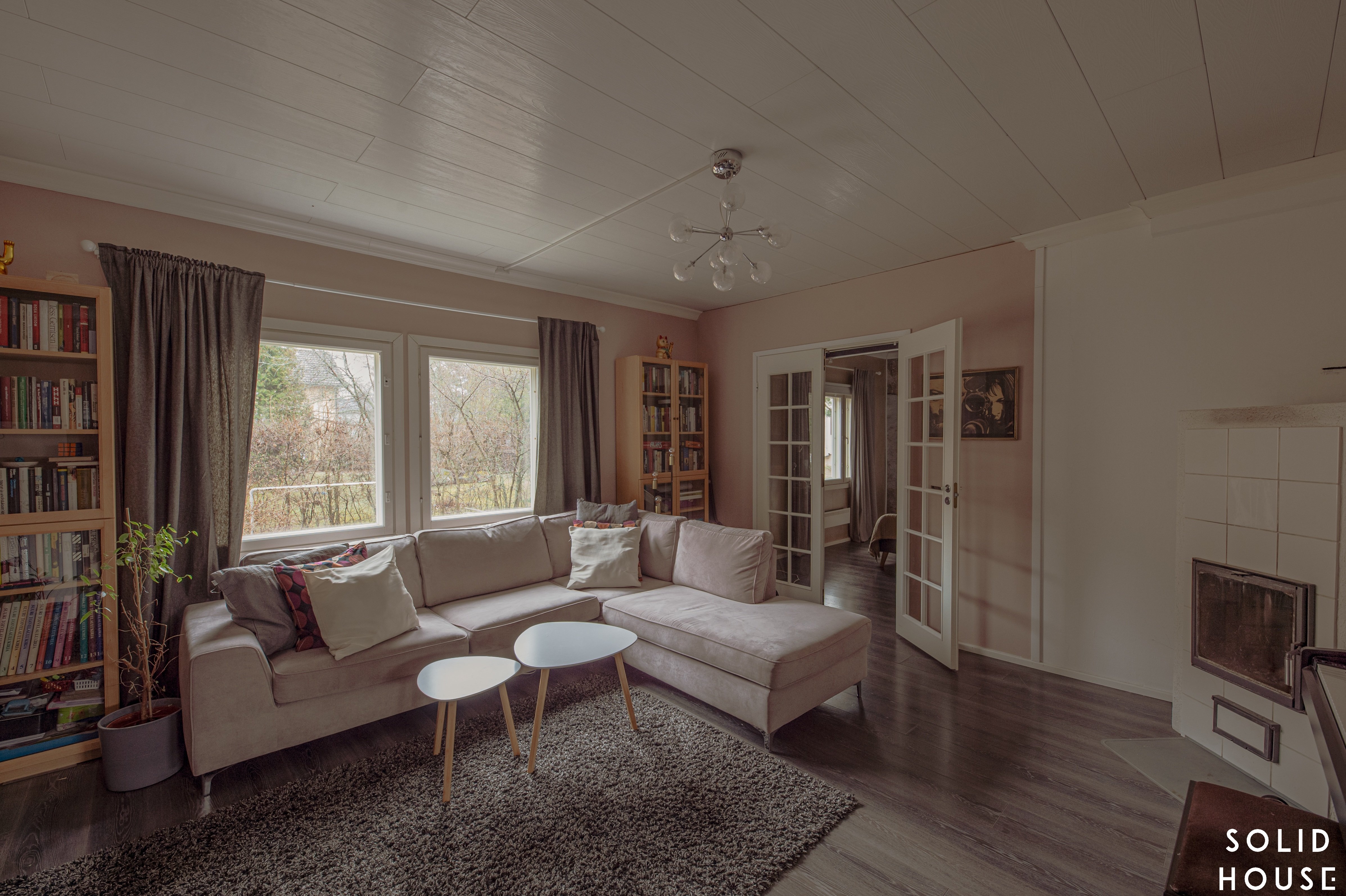 - Rakennuslupapiirustusten mukaan 1. kerroksen huoneistoala on 65 m2. Tämän lisäksi ilmoitettuun asuinpinta-alaan sisältyvät kellaritiloista sauna, kylpyhuone ja pukuhuone noin 30 m2. Näiden tilojen osalta pinta-ala on suuntaa-antavasti laskettu rakennuslupapiirustuksista. Ullakon tilojen osalta asuinpinta-alaan on laskettu yli 160 cm korkea tila, yhteensä 18 m2, joka perustuu myyjän tekemään mittauksee. Rahuraportin mukaan: kerrosala 115 m2, kokonaispinta-ala 196 m2 ja kellarin pinta-ala 81 m2. Pinta-aloja ei ole tarkistusmitattu eikä pinta-alatietojen paikkansapitävyyttä ole voitu varmistaa, joten todellinen asuinpinta-ala saattaa poiketa olennaisestikin ilmoitetusta.