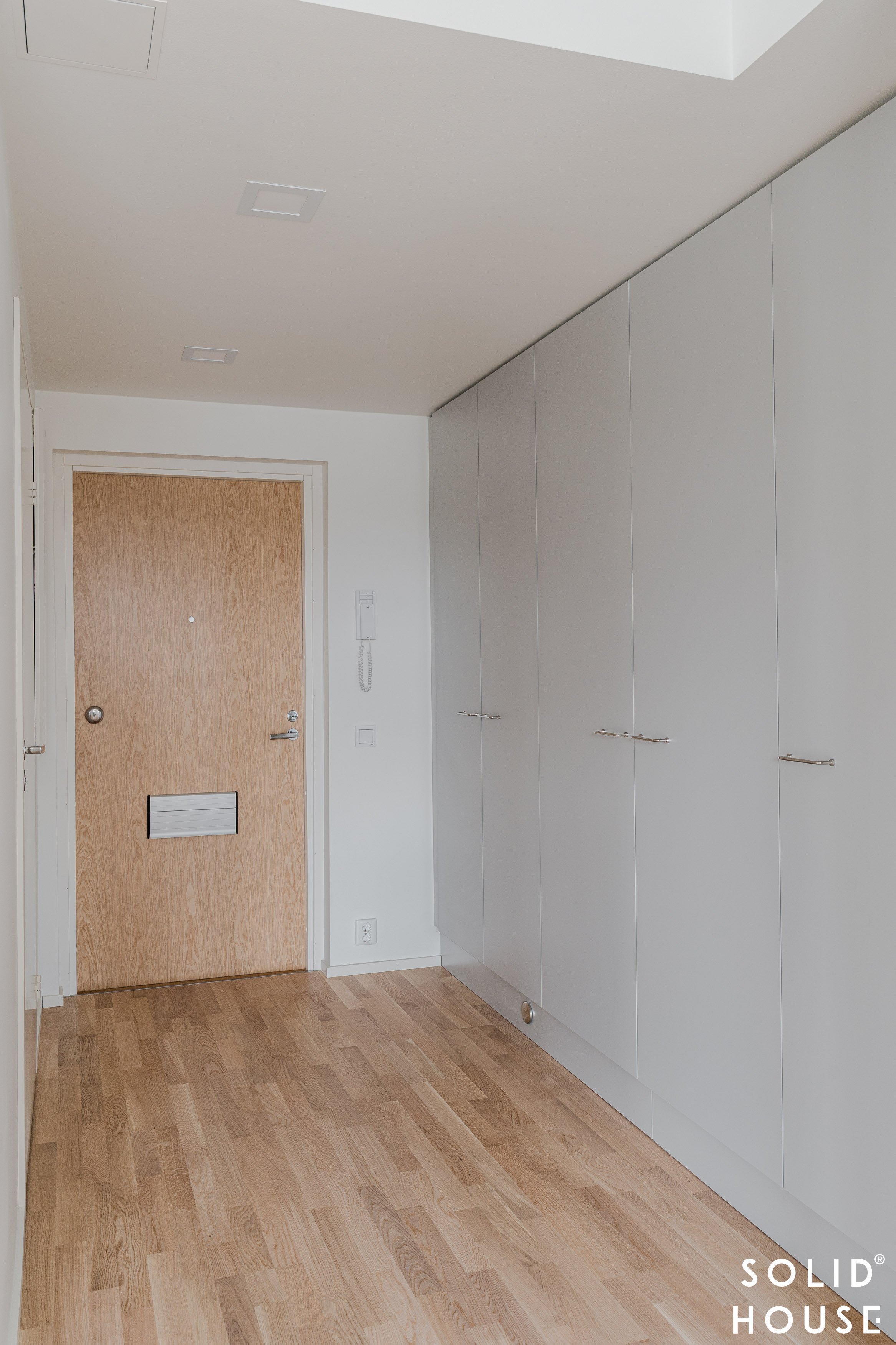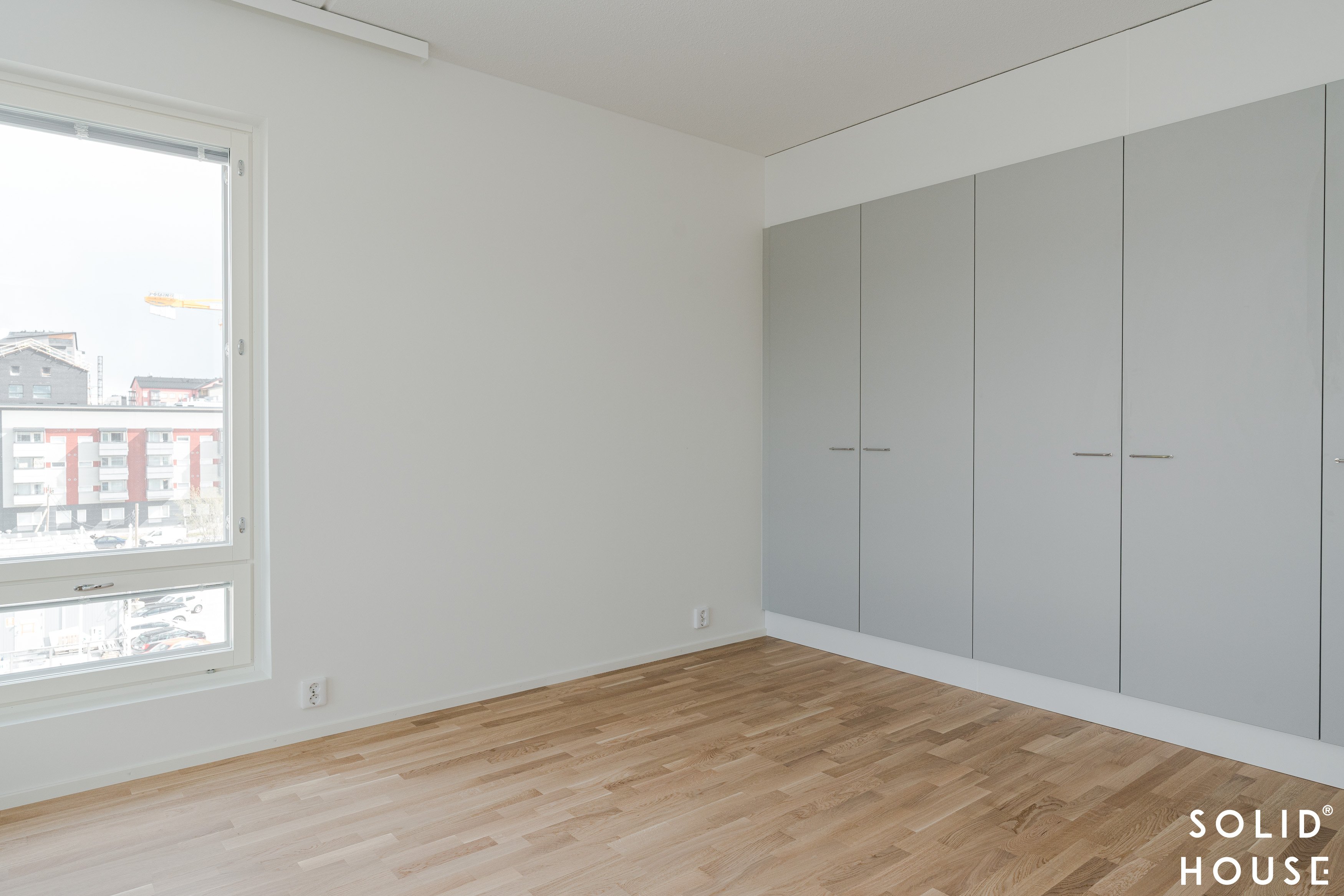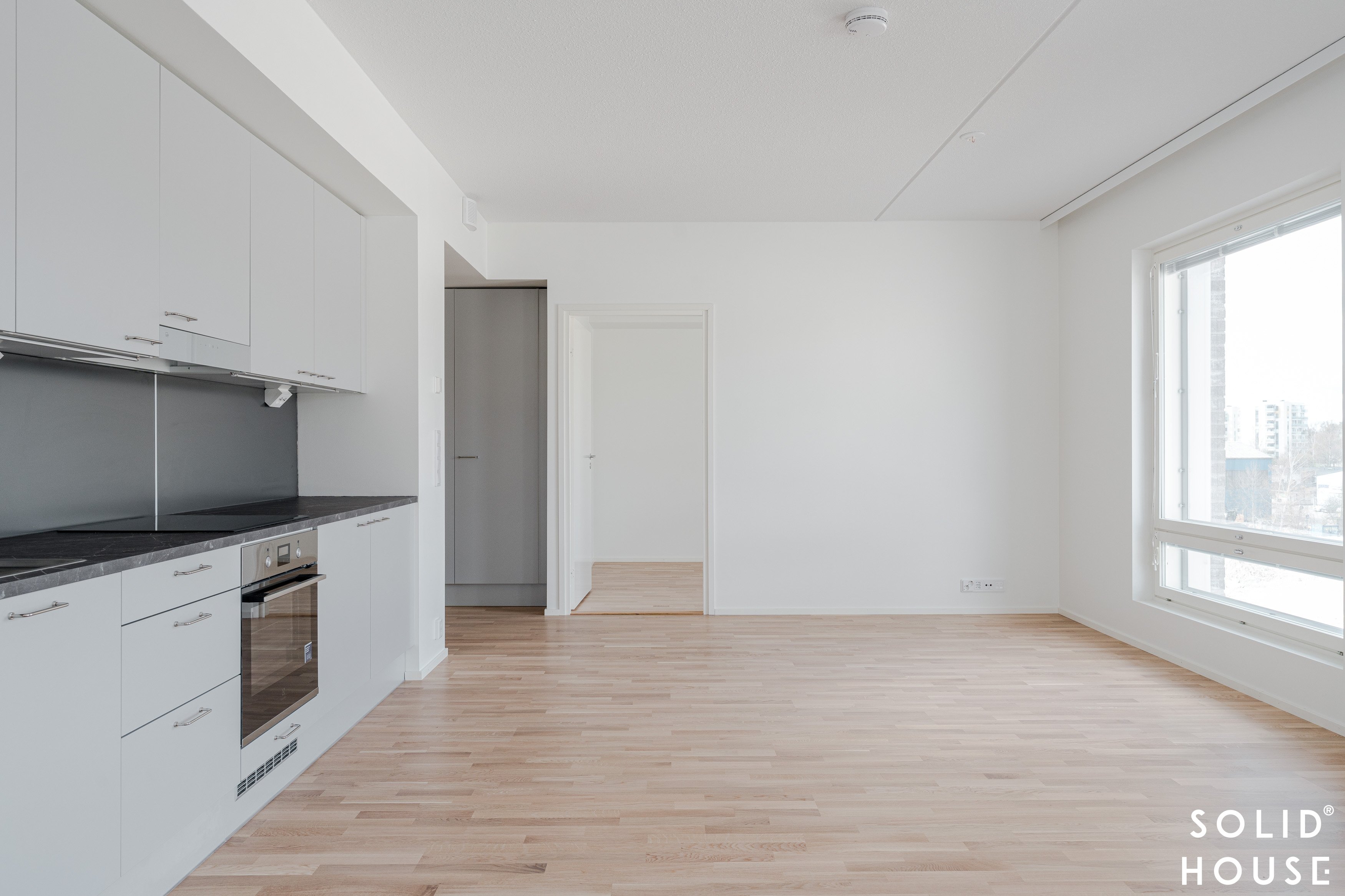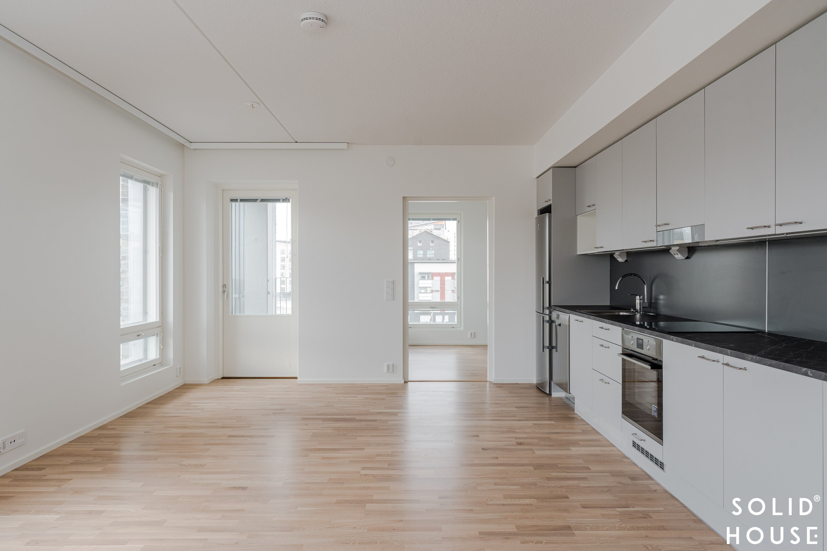 Tämän viidennen kerroksen (5/8 krs) kulmahuoneisto hurmaa harmonisella värimaailmallaan, jossa moderni ja klassinen kohtaavat tyylikkäästi. Seinät on maalattu raikkaan valkoisiksi, ja lattiat ovat ajattoman kaunista tammilautaparkettia. Kodin ilmettä täydentävät eteisen tyylikkäät harmaat kaapistot sekä ryhdikäs, mutta pehmeän sävyinen harmaa keittiö, joka luo rauhallisen ja elegantin tunnelman. Keittiö, olohuone ja ruokailutila muodostavat avaran ja yhtenäisen kokonaisuuden, jossa valo pääsee virtaamaan kauniisti. Tilavia makuuhuoneita on kaksi, ja oma sauna tuo arkeen ripauksen luksusta. Vesikiertoinen lattialämmitys takaa miellyttävän tasaisen lämmön koko kodissa – ilman häiritseviä pattereita, jotta esteettinen ilme säilyy.
