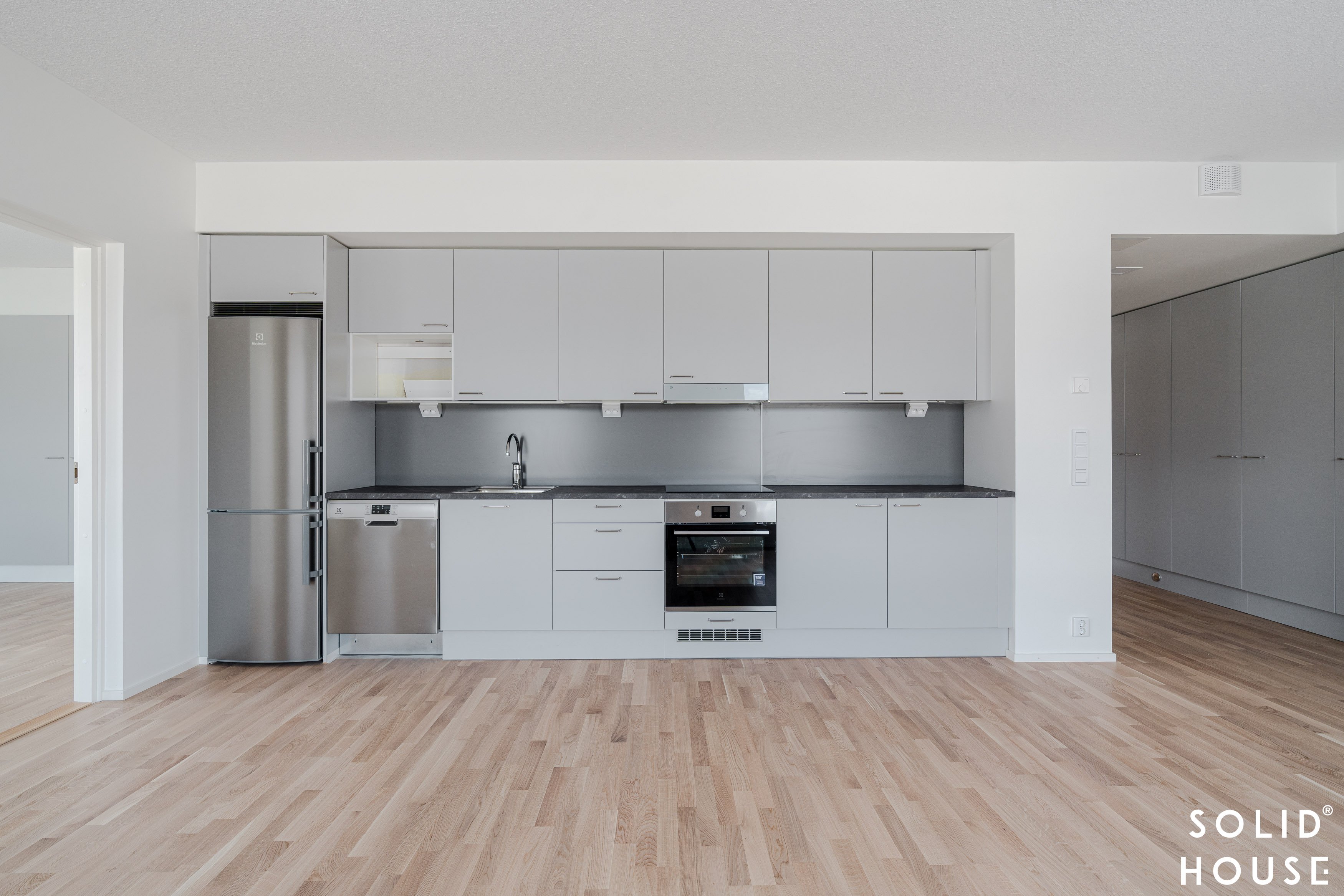 Varustus: kaapistot, laminaattityötaso johon upotettu rosteriallas. Electroluxin kodinkoneet; kalusteuuni, induktio keittotaso, jääkaappipakastin ja astianpesukone sekä ulosvedettävä liesikupu. Oraksen kaarihana pesukoneventtiilillä. Tilavaraus mikroaaltouunille.