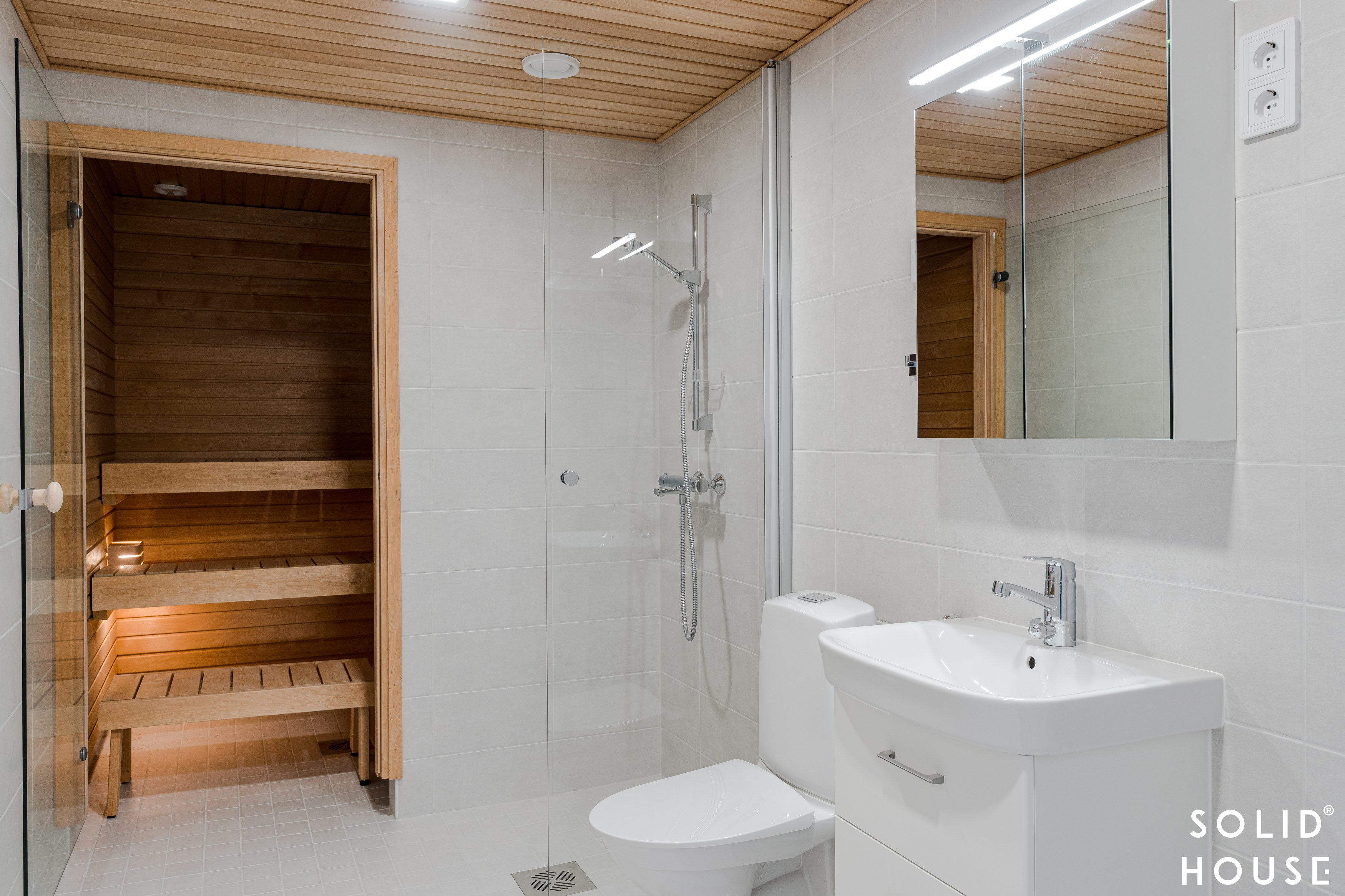- Varustus: peilikaappi led-valolla ja allaslaatikosto, wc-istuin, suihku, kääntyvä suihkuseinä sekä liitäntä ja tilavaraus pyykinpesukoneelle ja kuivausrummulle.